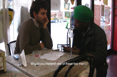 L’impact visuel des images génère à la fois une dichotomie et une littéralité sur le thème de la différence. Leur réelle signification n’est véritablement révélée qu’à travers l’erreur d’interprétation, toujours d’actualité, des deux hymnes. Le texte/communiqué de presse, Col Sole in Fronte, à l’entrée du module de projection, peut être envisagé comme une piste de lecture de l’œuvre tant il souligne le caractère factice de l’image de l’Italie comme pays ensoleillé « Bel Paese ». Le casting des acteurs par l’artiste dans Duetto per Cannibali, étant extrêmement lié à Facetta Nera, Facceta Bianca, sera visible sur demande pendant le temps du salon.