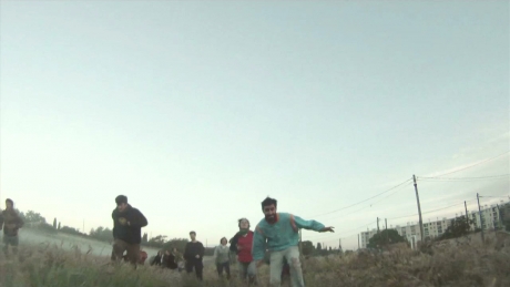 L’humeur des vidéos de Couderc semble a priori plus inquiétante. On y court souvent, parfois à perte d’haleine. Le plus souvent, elles mettent en images des séquences dynamiques, d’accélération, de fuite, de fuite en avant, de lutte ou de poursuite, comme dans Le Vallon où le regard implicite de l’artiste, objectif invisible de la caméra est poursuivi dans une improbable chasse à courre ou, plutôt, à pied, à cor et à cris par une bande de figurants dont on hésite à cerner les intentions.