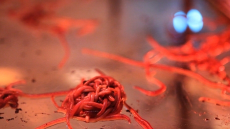 Couderc joue en les accentuant sur les chiasmes perceptifs et narratifs, les disproportions et décalages d’échelle et de contextes, pour atteindre un climax par l’irruption progressive et surprenante de ces créatures que nous portons tous en nous - des vers de terre. Faux- fuyant, farce décalée, parodie douce-amère de l’existence, on vous laissera en juger. Le dispositif sculptural de monstration, à la fois absorbant, expansif et déstabilisant, retiendra le spectateur le temps qu’il faudra pour qu’il se fasse son idée.