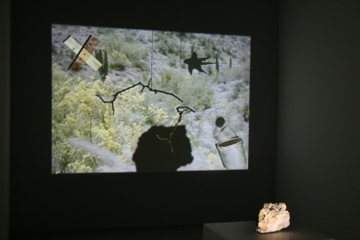 Seau en plastique, bâton en bois, pierre, branche d'arbre, piédestal, projection vidéo monocanal, son