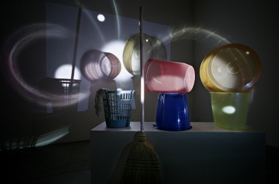 Seaux en plastique, serpillière, balai, socle, projection vidéo monocanal, son