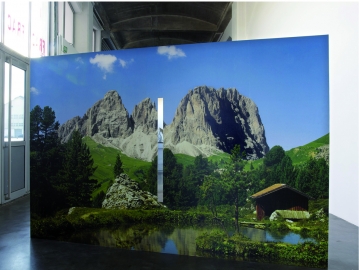 Une œuvre importante de Nicolas Milhé ferme la scène sur l’un des côtés pour offrir une vision latérale de toutes les œuvres exposées. La façade de Meurtrière (Dolomites) présente le cliché de carte postale d’un paysage paradisiaque dans les Dolomites. Derrière les apparences, on découvre les mécanismes en jeu pour observer, organiser et contrôler jusqu’aux parcelles de territoire les plus pacifiques. Le vocabulaire formel de Nicolas Milhé a possède cette incroyable capacité à revendiquer une authentique portée politique, sans jamais se targuer pour autant de vouloir délivrer de message littéral ou frontal.