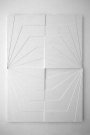 Le relief est plus présent dans le White Gradient de Florian et Michael Quistrebert. Les deux frères utilisent le gesso en le détournant de sa fonction initiale pour créer du relief. Proche du bas-relief, le White Gradient apparaît comme un élément architectural détaché de son contexte initial - vestige archéologique d’un bâtiment disparu.
