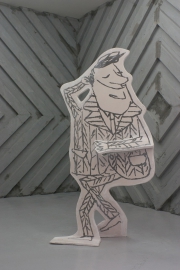 La démarche de Mick Peter s’inscrit formellement à rebours de celle d’Erica Baum. Ses sculptures sont justement sans relief ou, si relief il y a, celui-ci est assumé comme faux et ne prétend pas au réalisme. Les personnages apparaissent dans l’espace comme des êtres de papier - le dessin venant remplir l’espace blanc de la sculpture, à l’instar de la bande dessinée.