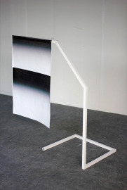 Pour la sculpture Offshore (Screen 3) Xavier Antin a repris le mode de fabrication des structures portantes de panneaux d’affichages pour la vente de maisons aux USA. Sa recherche a abouti à la construction d’une structure blanche, portant une impression issue d’expérimentation d’imprimantes jet d’encre, qui semble dessiner comme une ligne dans l’espace. On retrouve un relief de l’image, sur une feuille qui peut être appréhendée dans toute sa légèreté et sa finesse, puisque suspendue et détachée du mur.