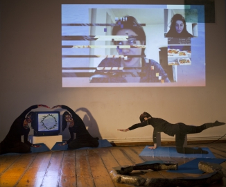 tapis de yoga, carton, papier-mâché, bois, tv, projection vidéo, DVD player, 4 livres