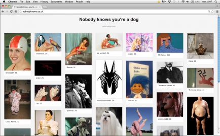 « On the Internet, nobody knows you’re a dog » est la phrase, apparut dans un des dessins de Peter Steiner pour The New Yorker en 1993, qui marqua le début de l’usage courant d’Internet comme sujet de discussion dans les revues généralistes. Le dessin évoquait des thèmes comme la confidentialité et l’anonymat sur Internet, thèmes qu’Elsa Philippe (Paris, 1987) place également au centre de ses recherches. Dans Nobody knows you’re a dog (2014), l’artiste s’approprie d’une partie de la phrase de Peter Steiner pour le titre de son projet de base de données en ligne, dans lequel les visiteurs d’un cybercafé de Londres peuvent publier à l’infini leur identité à travers des images trouvées sur le web. Ce travail illustre non seulement ce que le dessin symbolise mais en même temps il souligne l’extrême facilité avec laquelle l’utilisateur
