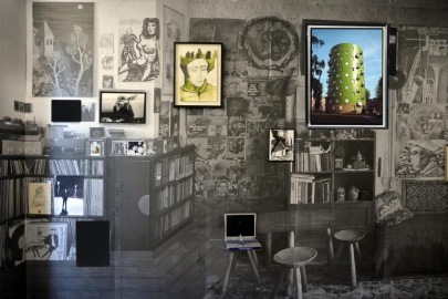 "Tel un décor de film, j’ai rendu mon "salon" transportable et métamorphosable, à travers une installation qui, à la manière d’un grand collage photographique, juxtapose des univers en mêlant œuvres, objets, pour ouvrir un voyage à la fois poétique, historique et interroger le spectateur sur la place et le rôle de l’art ainsi que sur l’évolution de l’espace de communication dans notre quotidien, dans nos vies."