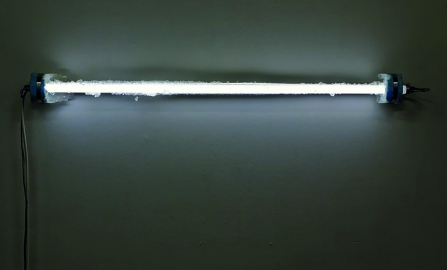 Cristallisation, 2015, est une sculpture-assemblage qui reproduit en termes minimalistes et de façon exacte le processus chimique de cristallisation à travers l’alun. Un néon fluorescent électrifié est renfermé hermétiquement dans une enveloppe de plexiglas et génère la chaleur nécessaire pour la transformation des cristaux, rendant ainsi cette sculpture un laboratoire évolutif où la matière inerte se recompose sous les yeux du public.