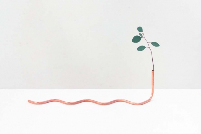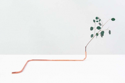 "To fit a Prothesisis" de Sarah-Jane Hoffmann est une série d'objets, réalisés à partir de tubes incurvés en cuivre et de branches d'Eucalyptus. Les silhouettes en cuivre ont été réalisées spécifiquement pour ce type de plante et pensées comme des subsituts de corps, afin de permettre à la plante de réaliser différentes poses. Cette série traite de nos tentatives de façonner la nature en fonction de nos goûts.