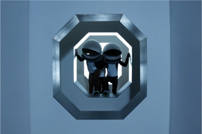 Par des effets de cadrages et la justesse du décor et des costumes, le spectateur se laisse happer par les "non évènements" éprouvés par les enfants, dans une mise en scène parodique de tout notre inconscient nourri de science-fiction et de films de série B. La structure qui contient la vidéo est elle-même un pied de nez invraisemblable : sorte d’archétype de capsule spatiale qui aurait troué l’espace d’exposition pour s’y échouer, l’environnement contraint cette fois les corps des spectateurs, qui doivent courber l’échine pour entrer dans la capsule et découvrir le film, en devenant ainsi eux-mêmes des acteurs de l’installation.