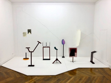 Les objets sont là, les images aussi : un manteau bicolore, des anneaux de gymnastique à côté d’un slip noir, des dessins ou fonds accrochés aux murs… Des accessoires pour une performance à venir ou restes d’une scène que les acteurs viennent de quitter ? Des décors ? Ou encore des dispositifs destinés à être manipulés par le public ? Certains d’entre eux fonctionnent aussi comme des outils d’observation de notre envi- ronnement, comme des viseurs qui dessinent des lignes de fuite. C’est comme si “le cran de mire” et “le guidon” d’un pistolet n’attendaient que notre regard pour s’aligner. Mais ici, il n’y a ni cible certaine, ni projectiles. Il n’y a que des corps qui regardent vers leur liberté. Ces objets nous invitent à bouger dans l’espace afin de trouver une bonne place, mais que nous ne pouvons identifier. La vision proposée par Mazzei est généreuse : s’il n’y a pas de bonne place pour le spectateur, c’est parce que sa place est partout. Nous nous sentons ethnographe, acteur, arlequin ou fou, mais jamais intrus. Oserons-nous les toucher, ces objets aux allures de pièces ritualistes ? Oui ! Car ces objets, insérés dans une logique animiste, attendent quelque chose de nous. Ils sollicitent notre volonté silencieuse et expriment le désir sincère de notre présence.
