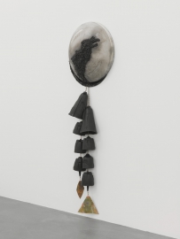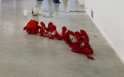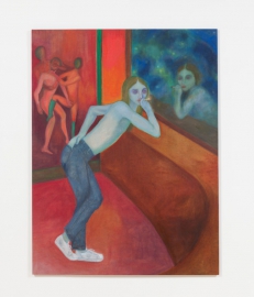 Une peinture grand format (acrylique sur toile) exposée à l’occasion du solo show de Matthew Lutz-Kinoy au Consortium de Dijon, Southern Garden of the Château Bellevue, est le point central du stand, servant de toile de fond à l’exposition collective ; des sculptures de Cooper Jacoby, accrochées de part et d’autre de la peinture (avec des éléments sonores) et exposées à l’occasion de son récent solo show « Disgorgers » à la Fondation Luma à Zurich ; une peinture (huile sur toile) de Jill Mulleady exposée à l’occasion de son solo show « Angst vor Angst » à la Kunsthalle de Bern ; et des impressions numériques sur plexiglas de Stefan Tcherepnin de sa récente exposition « Mad Masters » au Stedelijk de Amsterdam. Des sculptures au sol de Phillip Zach exposées au sein de l’exposition collective « Crashtest » à La Panacée à Montpellier, sont disséminées sur le sol du stand.