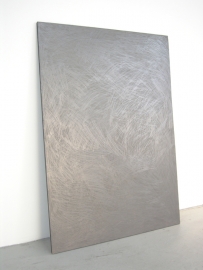 Face A, Un panneau de bois noirci de traits de graphite marquant le mur de l’espace d’exposition. À côté, deux Miroirs noirs, photocopies de compositions d'images occultées par la réflexion de papiers miroirs.