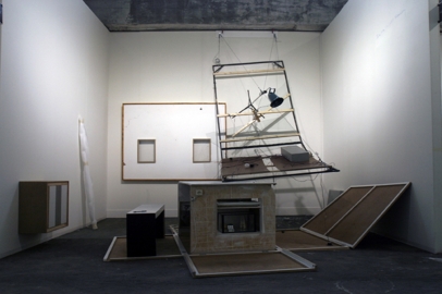 Dans une conversation avec Laura Havlin à propos de ce travail, Joris van de Moortel explique "Certaines pièces passent par des processus extrêmes pour être arrachées à leur fonction originale. Elles sont des tentatives de capture, d’accumulation d’énergie. Elles font l’effet de bombes à retardement prêtes à exploser à n’importe quel moment. J’utilise des matériaux de construction et de véritables objets usuels ou des instruments de musique, parfois, reproduits en bois. Je les entasse, les amalgame, les enserre dans du bois et les recouvre de plexiglass ou bien je les fais pendre du plafond dans des sacs poubelle. Ces pièces évoquent des décors de scène ou les restes de performances tenues secrètement. Elles sont inspirées de situations fortuites, d’atmosphères et n’ont en général aucun début, milieu, ou fin définis. Après une exposition ou parfois pendant, je détruis, brûle, roule au buldozer sur les œuvres et recycle leurs restes. Défaire devient une part du Faire."1