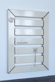 tôle, métal thermolaqué, grille de ventilation, encre de calligraphie, papier adhésif